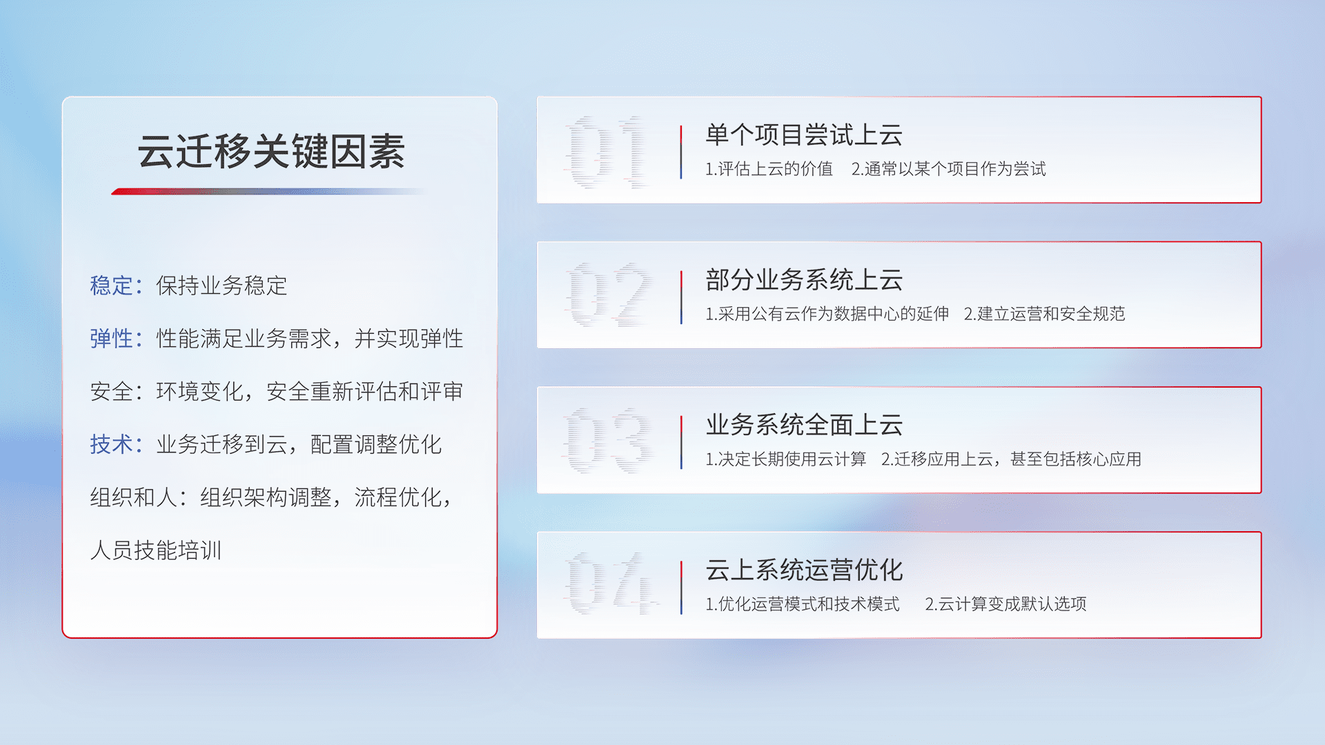 结合实际业务,,,从规划设计、、云平台选型、、、、云原生改造、、、、数据迁移、、、集成交付,,,迁移全过程为客户识别最佳上云路径,,做好风险识别管理,,设计网络架构、、、、身份权限、、安全审计合规、、操作审计、、、、日志审计、、、、监控告警策略、、、多站点容灾设计等,,,,对云上基础设施进行整体规划,,提升IT治理水平,,以满足弹性、、、、高可用、、、高性能的需求。。。
